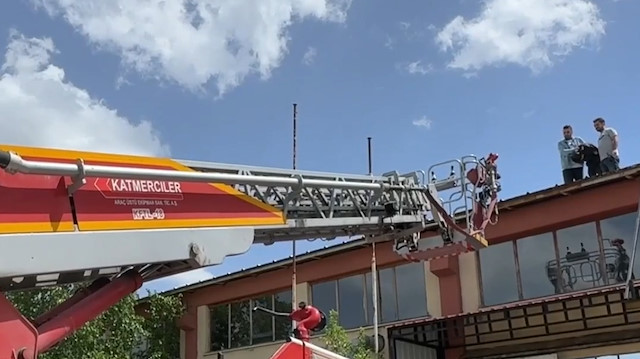 Kütahya'da hırsızlık yaptığı iddia edilen şüpheli, kovalamaca sonucu saklanmak için çıktığı binanın çatısında yakalanarak itfaiye merdiveni aracılığıyla indirildi.