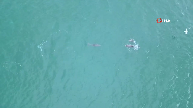 Düzce'nin Akçakoca İlçesi'nde, Karadeniz açıklarında dans eden Yunus balıklarının görüntüsü dron kameralarına takıldı.
