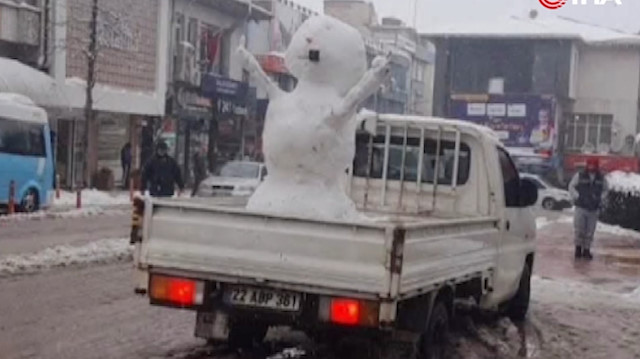 Edirne'nin Keşan ilçesinde vatandaşların kamyonetin arkasında yaptıkları kardan adama şehir turu attırdığı görüntüler sosyal medyada viral oldu. Keşan ilçesinde etkili olan kar yağışı nedeniyle kamyonetinin kasasında biriken karlardan kardan adam yapan sürücü, yaptığı kardan adam ile şehir merkezinde tura çıktı. Kamyonet ile şehir merkezinde tur attırılan kardan adamın kaydedilen görüntüler sosyal medyada yayınlandı. Bu görüntüler, kısa sürede geniş kitleye ulaşırken, şehri beyaza bürüyen kar dron ile havadan görüntülendi. Vatandaşlar da, uzun süredir beklenen kar yağışı sonrasında karın tadını çıkarttı.