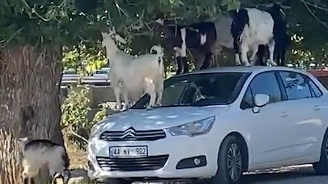 Elazığ'da bir otomobilin üzerine çıkarak yaprak yiyen keçiler görenleri gülümsetti. Sosyal medya kullanıcıları tarafından ilgi gören video izleyenlere tebessüm ettirdi.