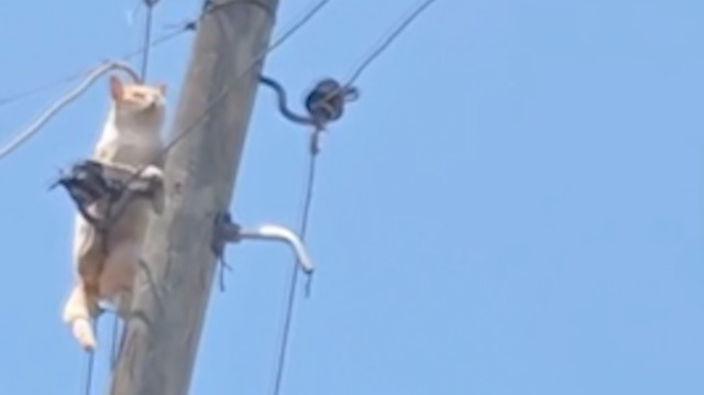 Karabağ köyünde elektrik direğine tırmanan kedi burada mahsur kaldı.