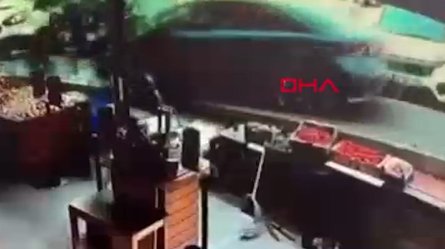 Kaza anında kaldırımda oturan market çalışanı, aracı fark ederek refleksle kendini yere atmaya çalıştı. Ancak çarpmanın etkisiyle hafif şekilde yaralandı. Kazaya karışan otomobille birlikte toplam 3 araçta hasar oluştu. O anlar güvenlik kameralarına saniye saniye yansıdı.