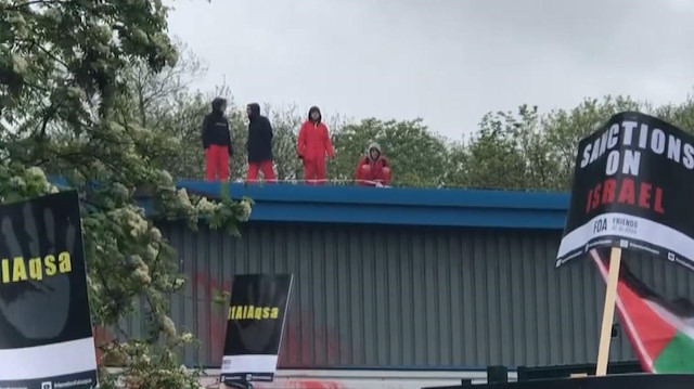 Filistin yanlısı eylemciler, İsrail'in İngiltere'nin Leicester kentindeki SİHA fabrikasında üretimi durdurdu. Fabrikada 2 gündür üretim yapılamıyor. Bir grup kendilerini kapıya zincirlerken çatıya çıkan 4 kişilik bir grup da Filistin bayrağı açıp binanın duvarlarını İsrail'in döktüğü kanı simgelediklerini söyledikleri kırmızı boyayla boyadı.