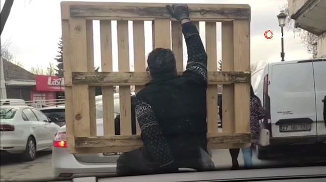 Gaziantep'te yoğun trafikte motosiklet üzerinde tehlikeli şekilde palet taşınma anları cep telefonu kamerasına yansıdı.