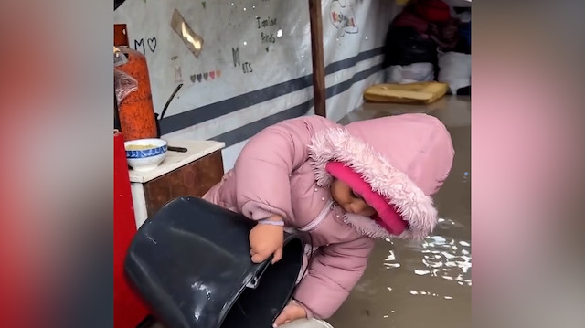 Çocuklar Su Tahliyesinde Görüntülerde, küçük yaştaki çocukların ailelerine yardım etmek amacıyla, çadırın içine dolan yağmur suyunu kovalarla dışarı taşıdığı anlar yer aldı. Pembe montlu küçük bir kız çocuğunun, ağırlığına rağmen su dolu kovayı çadırın dışına çıkarmaya çalışması kameralara yansıdı.