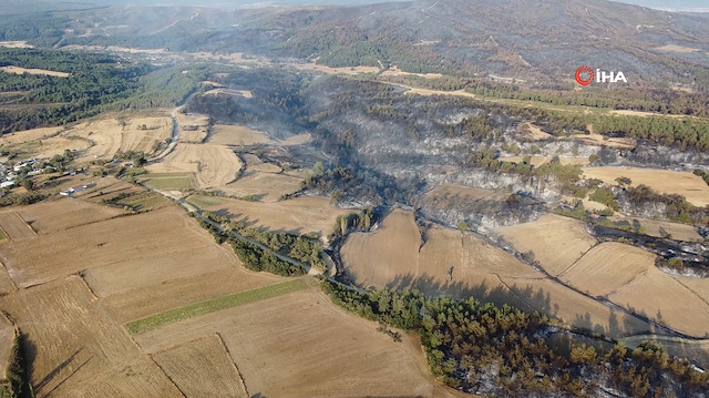 Çanakkale'nin Gelibolu ilçesinde çıkan orman yangınına Orman Bölge Müdürlüğü ekiplerinin karadan ve havadan müdahalesi devam ediyor. Yangından etkilenen ormanlık alan böyle görüntülendi. Yangın, Gelibolu ilçesi Ilgardere köyünde dün saat 15.00 sıralarında çıktı. Alevler rüzgarında etkisiyle büyüdü. İhbar üzerine bölgeye Orman Bölge Müdürlüğü ekipleri sevk edildi. Yangına havanın kararmasıyla karadan yoğun bir şekilde müdahaleye devam edildi. Gece saatlerinde büyük ölçüde kontrol altına alınan yangına güneşin ilk ışıklarıyla birlikte tekrardan havadan müdahaleye başlandı. Orman yangınında zarar gören yerler ise sabah saatlerinde dron ile görüntülendi.