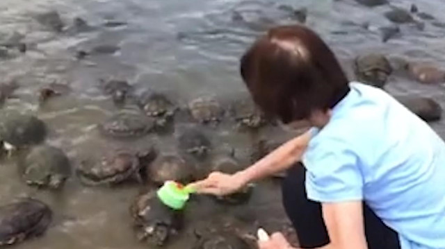 Singapur Botanik Bahçesi'nde kaplumbağa sürüsünün sırtını temizleyen yaşlı kadın, adeta bu davranışı ile yürekleri ısıtıyor. Sırtını temizletmek için sıraya giren kaplumbağalar, temizlik bittikten sonra kıyıdan mutlu ayrılıyor. İşte o anlar...