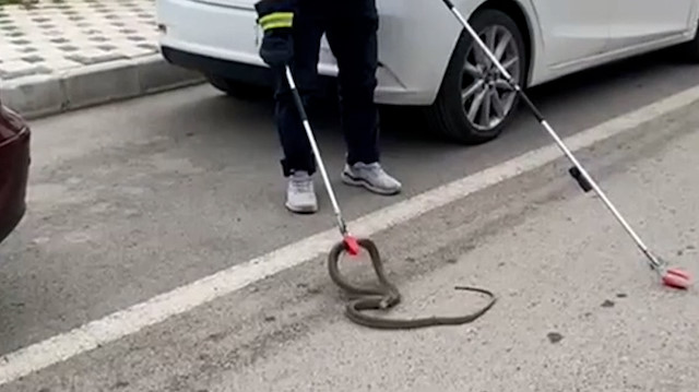 Karşıyaka Mahallesi'nde park halindeki otomobilin lastik kısmında yılan gören vatandaşlar, durumu 112 Acil Çağrı Merkezi'ne bildirdi. Bunun üzerine bölgeye sevk edilen itfaiye ekipleri, yılanı yakalayarak bir fileye koydu. Ekipler, daha sonra yılanı kırsal kesimde doğaya bıraktı.
