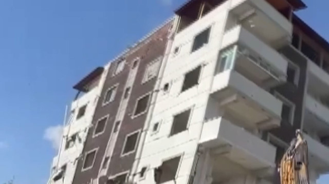Hatay'ın Defne ilçesinde 7 katlı binanın iş makinesinin darbesiyle yerle bir olduğu anlar kameraya yansıdı.