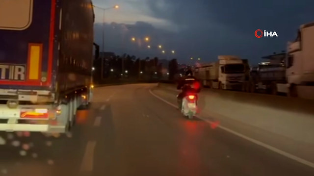 Hatay'da kuvvetli fırtınanın etkisiyle ilerlemekte güçlük çeken motosiklet sürücüsü, tırcının kendine duvar olmasıyla ilerledi. Tırın rüzgar kıran görevi gördüğü yürek ısıtan anlar takdir topladı.