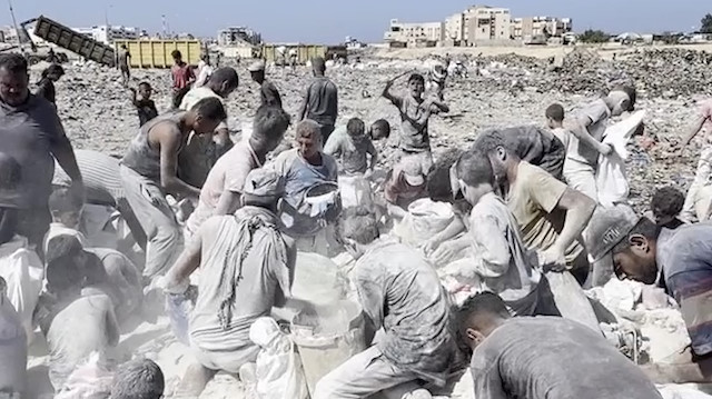 Gazze'nin güneyindeki Han Yunus kentinde bir grup Filistinli yere saçılan unları toplayarak temel gıda temin etmeye çalışıyor.