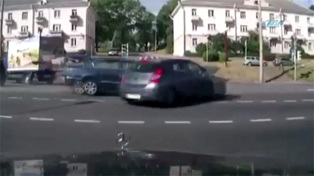 Belarus'un başkenti Minsk'te kırmızı ışık ihlali feci bir kazayla sonuçlandı. Kırmızı ışıkta geçen otomobil, önce yaya geçidini kullanan 2 kişiye, ardından da başka bir otomobile çarptı. Kazada çarpmanın etkisiyle metrelerce uçan 2 kişiden biri öldü, diğeriyse ağır şekilde yaralandı.