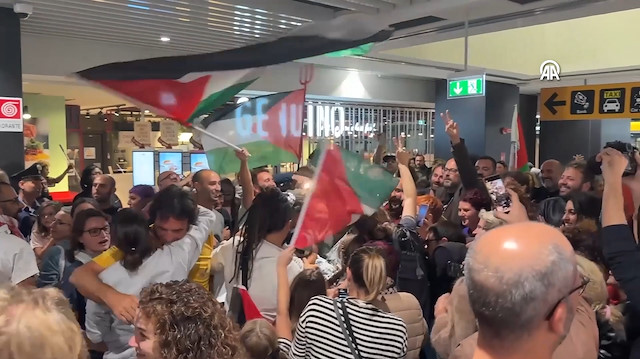 Söz konusu 7 kişiyi, aralarında ailelerin de bulunduğu 100'ü aşkın Filistin destekçisi, ellerindeki Filistin bayrakları ve tezahüratlarla coşkulu şekilde Fiumicino Havalimanı'nın 1 numaralı terminalinin geliş katında karşıladı.