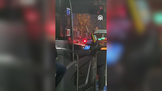 İETT otobüsü şoförünün 'İstanbulkart' basılan cihazın bulunduğu alana ayağını uzatarak aracını sürmesi cep telefonu kamerasıyla görüntülendi.