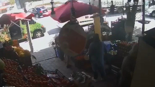 Görüntülerde, şemsiyenin kuvvetli rüzgar nedeniyle yerinden çıkarak manavda alışveriş yapan bir vatandaşın üzerine devrildiği anlar yer aldı.