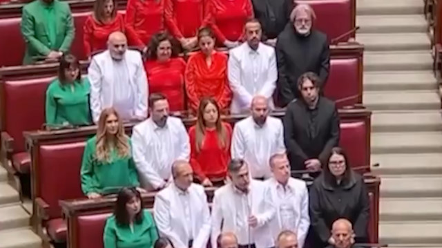 İtalya'nın muhalefet partilerinden Beş Yıldız Hareketi (Movimento 5 Stelle) milletvekilleri, Parlamento oturumunda Filistin'e destek amacıyla dikkat çeken bir protestoya imza attı. Milletvekilleri, doğrudan Filistin bayrağını açmak yerine, Filistin bayrağının renkleri olan siyah, beyaz, yeşil ve kırmızıyı taşıyan kıyafetlerle Genel Kurul salonuna girdi.