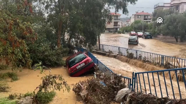 İzmir'in Foça ilçesinde etkili olan sağanak nedeniyle dere taştı, bazı ev ve iş yerlerini su bastı.