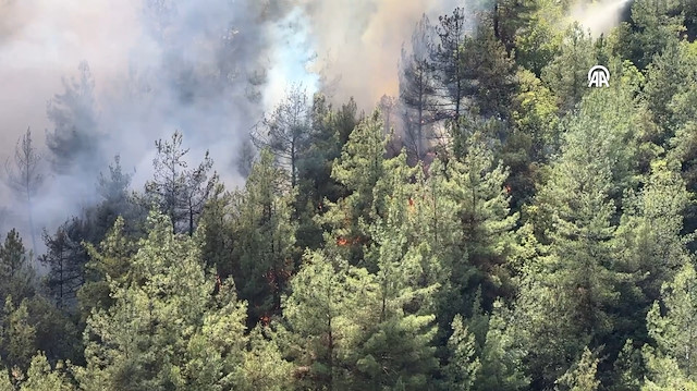 Ekiplerin yüksek ve eğimli bölgede etkili olan alevlere müdahalesi devam ediyor.