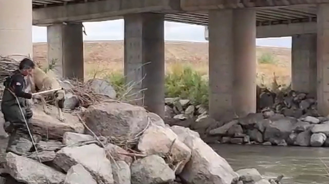 Erzincan'da Karasu Nehri üzerindeki köprünün ayağında mahsur kalan köpek, AFAD ekiplerince kurtarıldı.