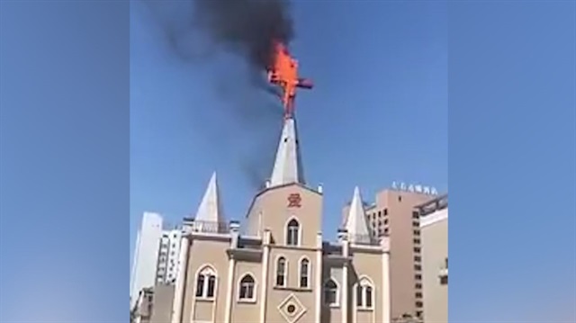 Çin'deki bir kilisenin çatı kısmındaki ahşap haç aniden yanmaya başladı. Olayla ilgili araştırmalar devam ediyor.