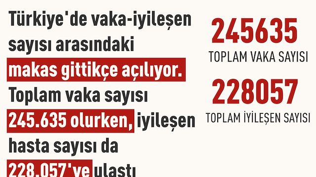 Türkiye'de günlük verilerde vaka-iyileşen sayısı arasındaki makas gittikçe açılıyor. Toplam vaka sayısı 245.635 olurken, iyileşen hasta sayısı da 228.057'ye ulaştı.