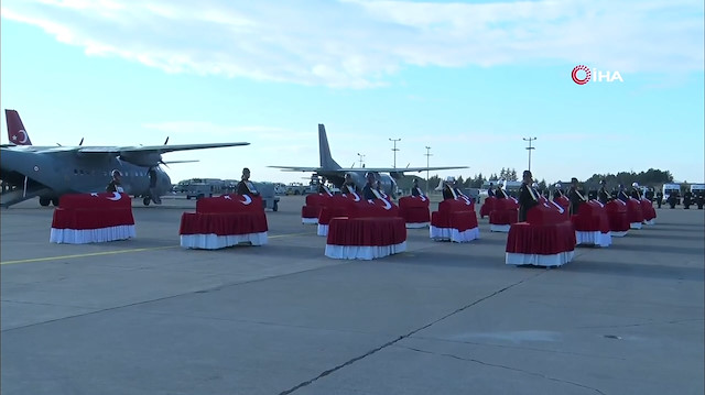 Şehitlerin Türk bayrağına sarılı naaşları askeri tören mangası tarafından katafalka alınırken, törene Milli Savunma Bakanı, Genelkurmay Başkanı, kuvvet komutanları, şehit yakınları ve çok sayıda asker katılıyor.