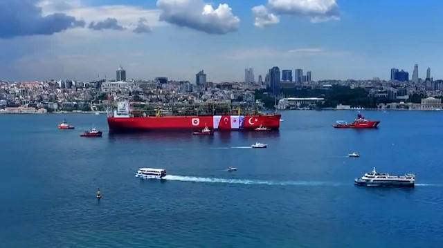 İstanbul Boğazı'ndan geçişini sürdüren Türkiye'nin ilk yüzer doğal gaz üretim platformu (FPU) Osman Gazi'ye, 9 kılavuz kaptan ile Nene Hatun Acil Müdahale Gemisi, römorkörler ve can kurtarma botu eşlik ediyor.