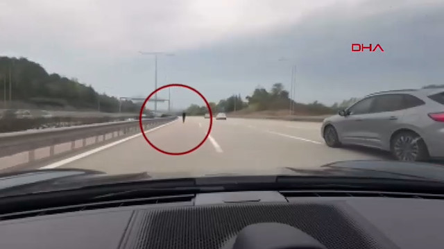 Bursa'da otoyolun sol şeridinden yürüyen yaya, kendisini fark eden otomobil sürücüsünün manevrası sayesinde kurtuldu. O anlar, araç kamerasına yansıdı.