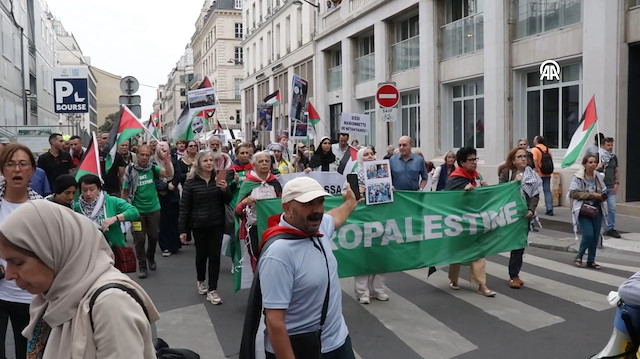 Paris'te yüzlerce kişi, EuroPalestine tarafından düzenlenen gösteri kapsamında bir araya gelerek Place de la Bourse'dan Place de Clichy'ye doğru yürüyüş gerçekleştirdi.