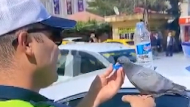 Erzincan'da görev yapan bir trafik polisi, sıcak havadan etkilenen güvercin yavrusuna pet şişe kapağıyla su verdi. Kentte, 13 Şubat Caddesi üzerinde görev yapan bir trafik polisi, bitkin halde bir otomobilin üzerine konan güvercini fark etti. Kendisinden korkmayan ve uçmayan güvercin yavrusuna yaklaşan polis, pet şişesindeki suyu içirdi. Valiliğinin sosyal medya hesaplarından yapılan paylaşımda, 'Bir damla suyla bir yüreğe dokunan polisimiz, Erzincan'ın merhametini, vicdanını temsil ediyor. Sadece güvenliği değil, hayatı da koruyan bu güzel insanı, polisimizi yürekten alkışlıyoruz.' ifadeleri yer aldı.
