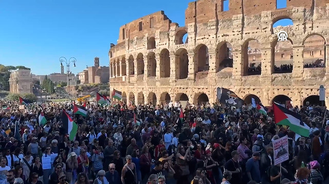 İtalya'nın başkenti Roma'da geniş katılımlı 'Gazze'de soykırım dursun' yürüyüşü düzenlendi. İsrail'in Gazze'de devam eden soykırımına karşı, İtalya'da protestolara her geçen gün bir yenisi ekleniyor. Başkentin Piramide semtinde dün öğleden sonra bir araya gelen yüzbinlerce kişi, 'Soykırım Dursun' ve 'İsrail'le suç ortaklığına son' yazılı dövizleri arkasında toplanarak, yürüyüşe geçti. Roma'nın simge yapısı Kolezyum önünden geçen kortej, San Giovanni Meydanı'nda son buldu. Ellerinde Filistin bayrakları ve 'Soykırımı durdurun' yazılı dövizler taşıyan göstericiler, 'Filistin'e özgürlük', 'Hepimiz antisiyonistiz', 'Hepimiz antifaşistiz', 'Katiller', 'Nehirden denize özgür Filistin', 'İntifada', 'Özgür Gazze', 'Siyonist, terörist devlet İsrail', 'Meloni istifa', 'Utanın' ve 'Hükümet istifa' şeklinde sloganlar attı. Bazı göstericiler de Filistin bayrağı renklerinde meşaleler yakarken, bir grup da bando eşliğinde yürüyerek ilgi çekti. Göstericiler, yürüyüş boyunca hem Gazze'de soykırıma devam eden İsrail'i hem de bu soykırımı durdurmadığı gerekçesiyle İtalyan hükümetini protesto etti.