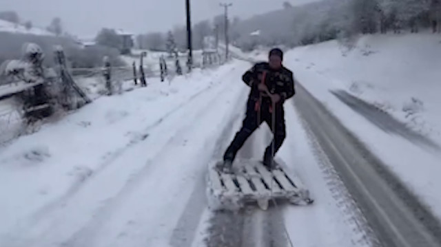 Karasu ilçesindeki Kurudere Mahallesi'nde bir vatandaşın traktörün arkasına bağladığı ahşap paletle kar üstünde 'su kayağı' yapması cep telefonuyla görüntülendi.