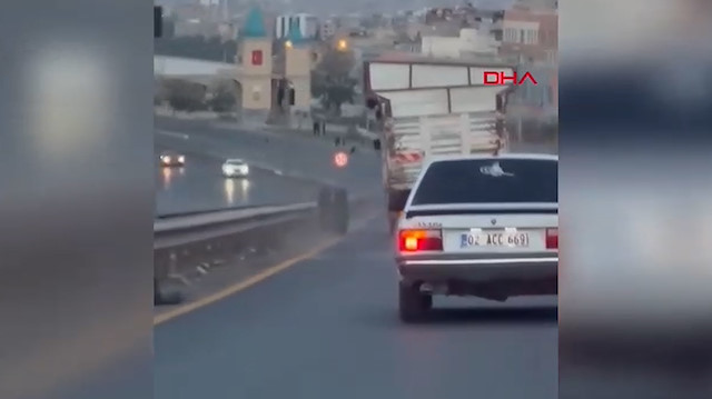 Şanlıurfa'da, seyir halindeki bir kamyonun dingili koptu. Tekerlekler bir süre yolda ilerlerken, o anlar cep telefonu kamerasıyla görüntülendi.