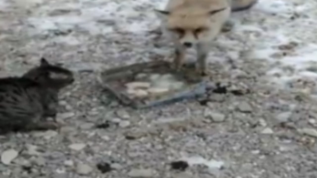 Aksaray'ın Gülağaç ilçesinde şantiye bekçisi İbrahim Düzgün, aç kalıp şantiyeye gelen tilkiyi, kedisiyle birlikte besledi. Şantiye bekçisi o anları cep telefonu kamerasıyla görüntüledi.