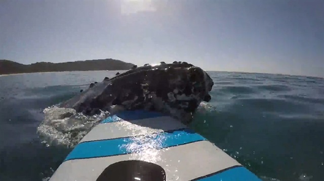 Avustralya'nın Crescent Head Back Plajı'nda gerçekleşen olayda büyük bir grup balinanın ortaya çıkması üzerine sörf tahtası üzerinde ve etrafında adam kürek çekiyordu, bir anda karşısına balina çıkınca şaşkına dönen sörfçü donup kaldı.
