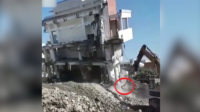 Ucunda demir küre bağlı olan kepçe operatörü, binanın taşıma kolonuna isabetli bir vuruş yaparak binanın yıkılmasını sağlıyor. O anlar başka bir inşaat işçisi tarafından böyle kayda aınıyor.