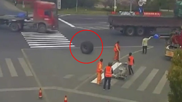 Çin'de bir otoyolda ilerleyen TIR'dan kopan 200 kilogram ağırlığındaki dev lastik yol kenarında çalışan bir işçiyi ezdi. Daha sonra bir motosiklete çarparak duran lastik, güvenlik kameraları tarafından kaydedildi. Kazadan sonra hastaneye kaldırılan işçinin sağlık durumunun iyi olduğu hayati tehlikesinin bulunmadığı belirtildi.