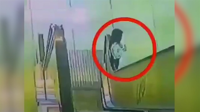 Alışveriş merkezinde yürüyen merdivende gerçekleşen olayı gören adam hızla yukarı koşarak büyük bir tehlikenin önüne geçmiş oldu. İşte o anlar...