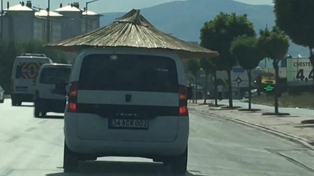Görüntüler dün akşam saatlerinde Konya'nın Selçuklu ilçesinde kaydedildi. Trafikte seyir hainde olan bir hafif ticari aracın üzerine bağlı bulunan şemsiye görenleri hayrete düşürdü. Trafikte yavaşça ve yolun en sağından ilerleyen aracı görenler bu anları görüntüledi.