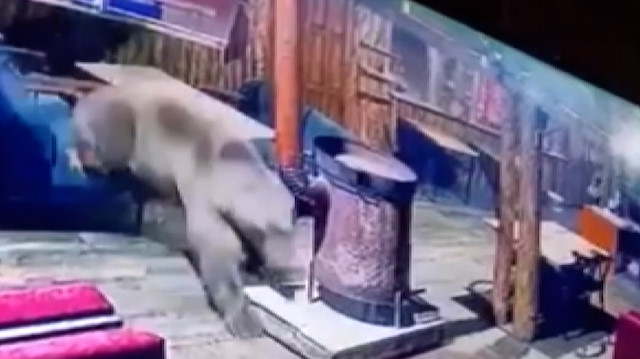 Türkiye'nin en önemli turizm merkezlerinden biri olan Uludağ Sarıalan'da gece saatlerinde yemek bulamayan bir ayı bölgedeki işletmeye girip masaları talan etti. Masaların devrilmesiyle korkan ayı hızla işletmeden kaçarken, o anlar güvenlik kamerasına anbean yansıdı. İşletmeye gelen dükkan sahibi ise görüntüleri izleyince ikinci bir şoku yaşadı.