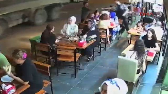 Yalova'nın Çınarcık ilçesinde, seyir halindeki kamyonun lastiği patladı. Çevredeki mekanda oturan müşterileri tedirgin eden o anlar, güvenlik kamerasına yansıdı.Olay, dün akşam saatlerinde, Çınarcık ilçesi Esenköy beldesinde Liman Mahallesi sahilinde meydana geldi. Sahil yolunda ilerleyen kamyonun arka lastiği, restoranın önünden geçerken patladı. Patlamayla birlikte çıkan ses ve yoldan mekana dolan toz bulutu, müşterileri tedirgin etti. Panikle yerlerinden kalkan bazı kişiler, hızla uzaklaştı. O anlar, işletmenin güvenlik kamerasına yansıdı.