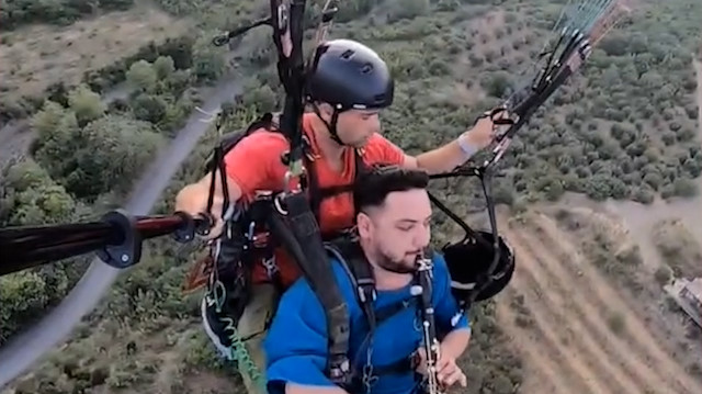 Tekirdağ'ın Şarköy ilçesine gezmeye gelen Yaşar Gümüş, yamaç paraşütüyle uçarken klarnet çaldı.