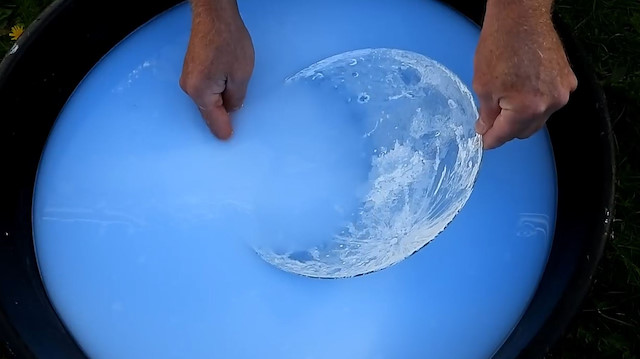 Yapılan deneyde, bir duvar saatinin camını boyayarak ay yüzeyine benzeten adam, siyah ve mavi renkli suya batırarak sonuçlarını böyle kaydetti.