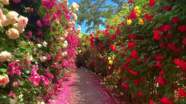Etrafında rengarenk güllerin asılı olduğu bu yol baharın gelmesiyle birlikte çiçek bahçesine dönüşüyor. Güney Kore'nin Jeju Adası'nda bulunan bu harika bahçeler özellikle mayıs ayından itibaren sokakları muhteşem bir gül noktalarına dönüştürüyor. Volkanik patlamalar sonucu oluşmuş enfes bir doğa harikası olan bu ada, UNESCO'nun Dünya Mirası Listesi'nde yer alıyor. Doğal güzelliklere sahip ada özellikle yaz aylarında turistler tarafından ziyaret ediliyor. Turistlerin adaya gelmesinin bir başka sebebi de muhteşem bitki ve çiçekleri barındırıyor olması. Adeta bir çiçek tünelini andıran bu yol renkli gülleriyle güzelliğine güzellik katıyor. Ağırlıklı olarak kırmızı ve pembe güller olsa da farklı renklere de rastlamak mümkün. Güllerin dökülen yaprakları ise yeri adeta bir gül halısına dönüştürüyor.