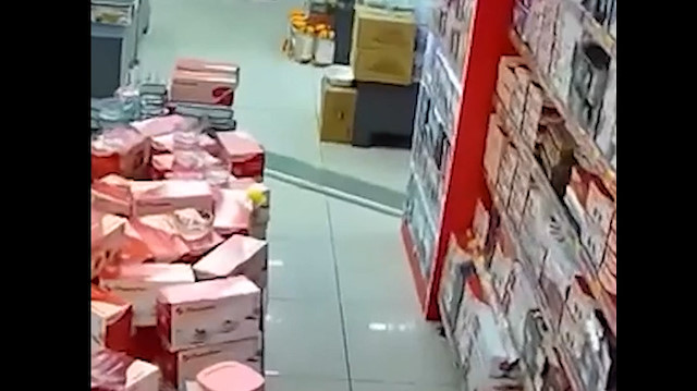 Balıkesir depremi Manisa'daki market kamerasından da görüntülendi. Deprem anında devrilen ürünler kamerasına yansıdı.