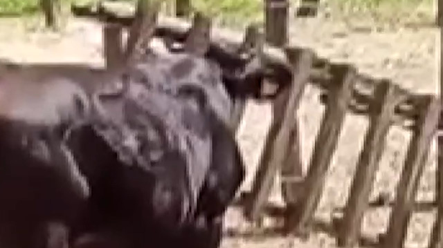 Meraklı ineğin başı ahşap merdivene sıkıştı
