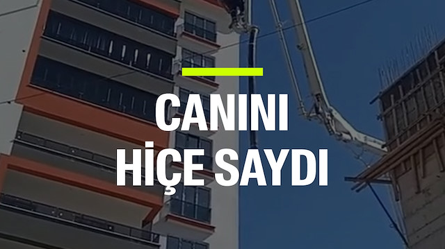 Elazığ'da bir işçi, beton pompa aracının hortumuna binerek metrelerce yüksekliğe çıkıp canını hiçe saydı. O anlar cep telefonu kamerasına yansıdı.