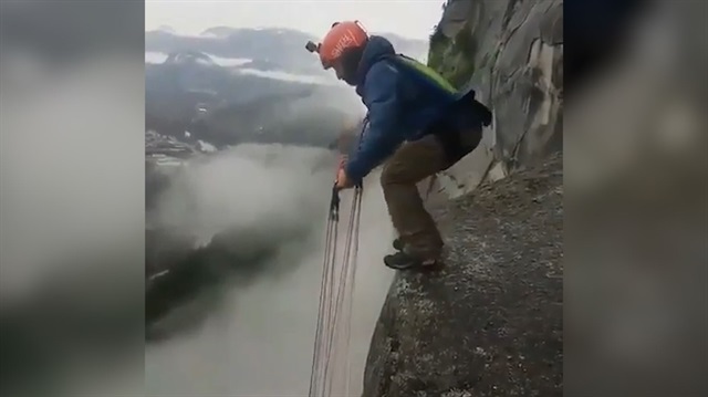 Ekstrem sporcu adam yüzlerce metre yüksek bir tepeden, paraşütünü açık bir konumda aşağı sarkıtıyor ve tuttuğu kontrol ipleriyle birlikte kendini boşluğa bırakıyor... O anlar ise arkadaşı tarafından böyle kayda alınıyor...