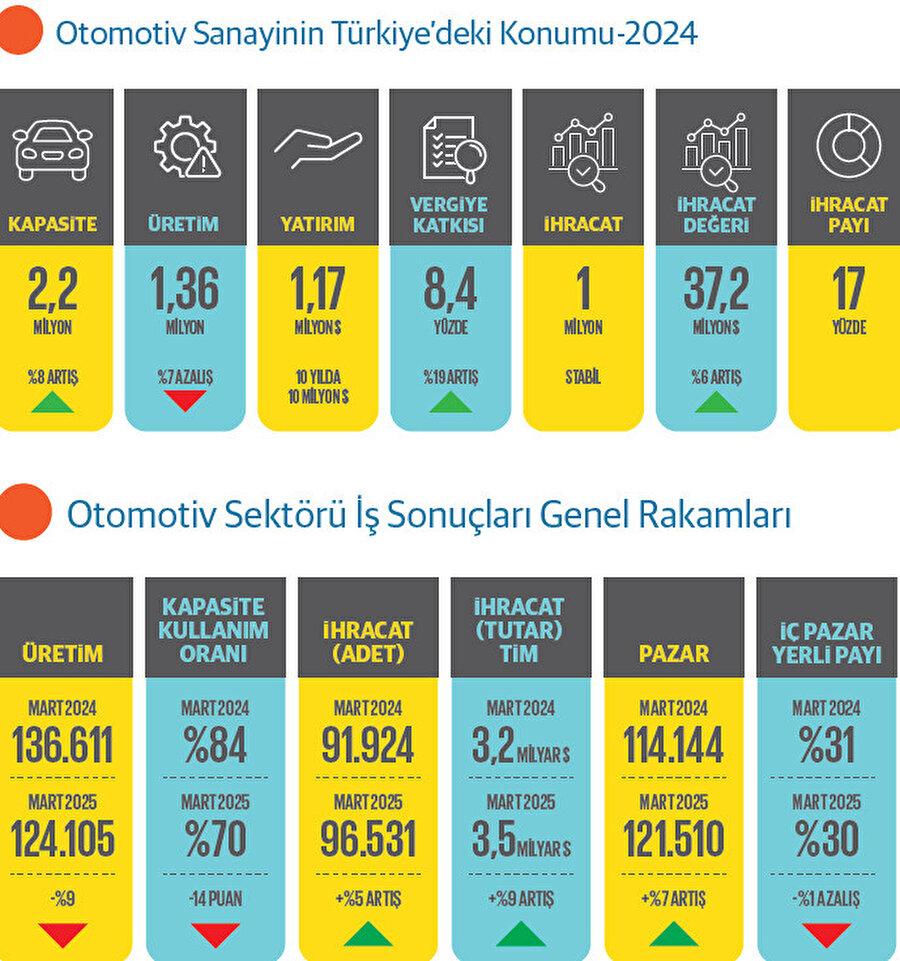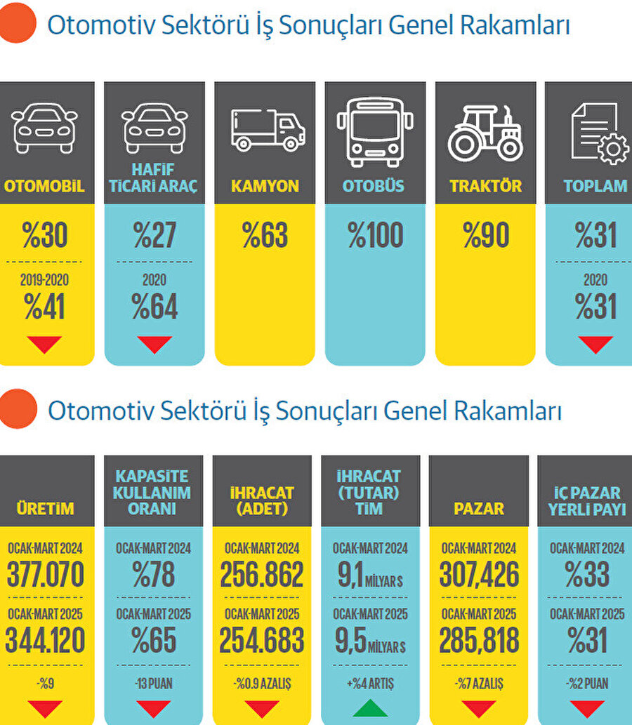 Bu dönemde, otomobil pazarı da yüzde 4 oranında gerileme yaşadı ve 223 bin 793 adet oldu. 2025’in ilk 3 aylık döneminde otomobil satışlarındaki yerli araç payı yüzde 32, toplam taşıt pazarındaki yerli araç payı ise geçen yılın ilk çeyreğine göre 2 puan düşerek yüzde 31 oldu.
