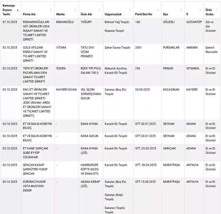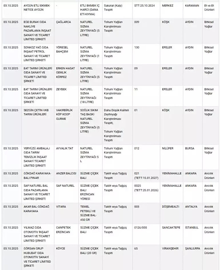 Listeye toplam 21 yeni ürün daha eklendi. Listede, peynir tereyağı ve yoğurt ürünleri eklendi. Buna göre, belirlenen peynir ve tereyağı ürünlerinin yağ oranlarının düşük olduğu belirlendi, Gaziantep Oğuzeli ilçesinde faaliyet yürüten bir firmanın yoğurdunda bitkisel yağ ve nişasta tespit edildi.